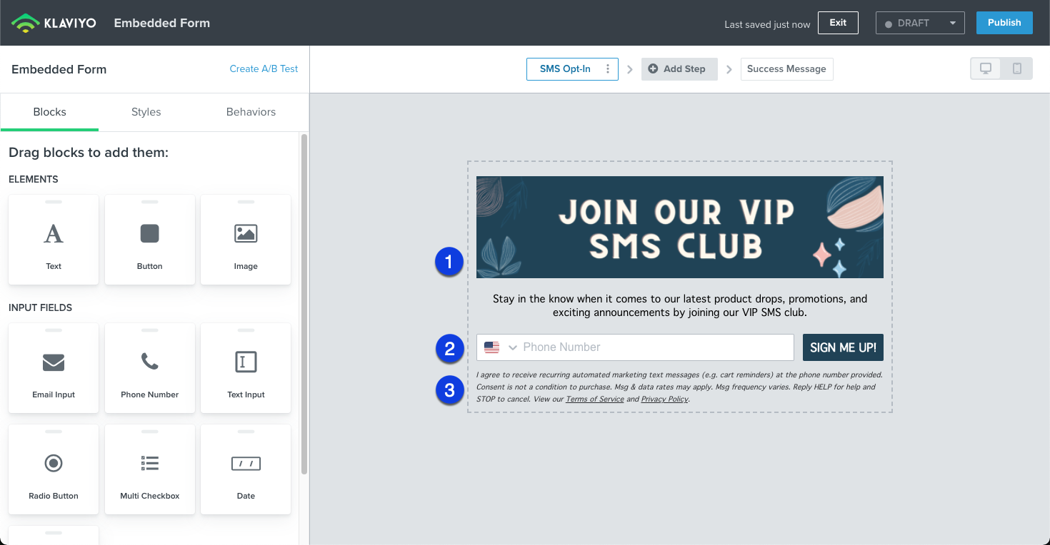 - Include compliant opt-in language directly before the phone field. Don't forget to add links to your Terms of Service and Privacy Policy.