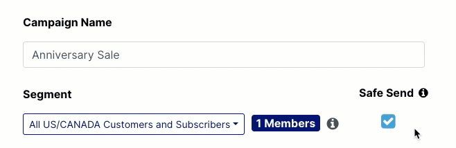 Merchants can disable Safe Send by deselecting the Safe Send checkbox to the right of the segment drop-down on a campaign message. In the example below, disabling SafeSend increases the segment from 1 subscriber (with Safe Send enabled) to 43 subscribers (with Safe Send disabled).