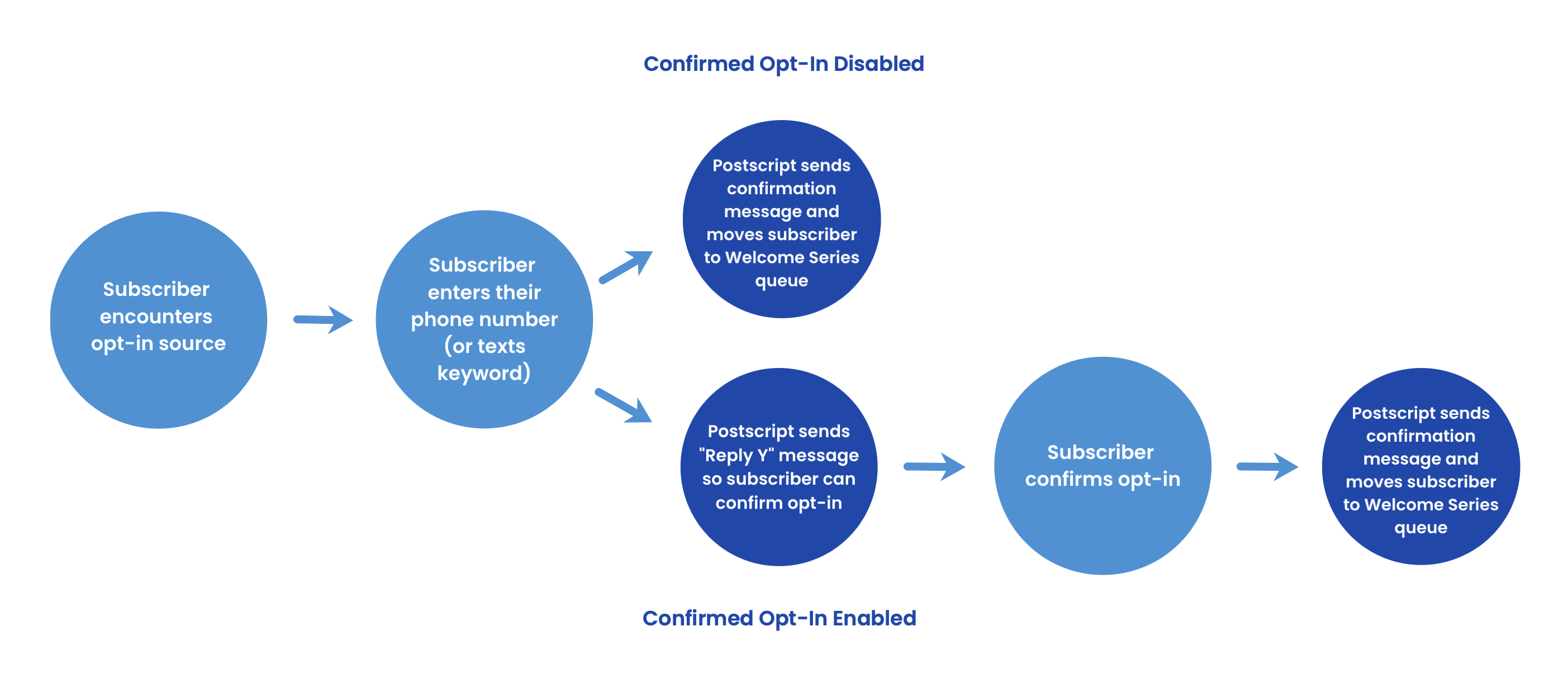 Here's a visual of the opt-in experience with Postscript. Note that the flow can go in one of two directions, depending on whether you have confirmed opt-in enabled. We talk more about confirmed opt-in in the next section.
